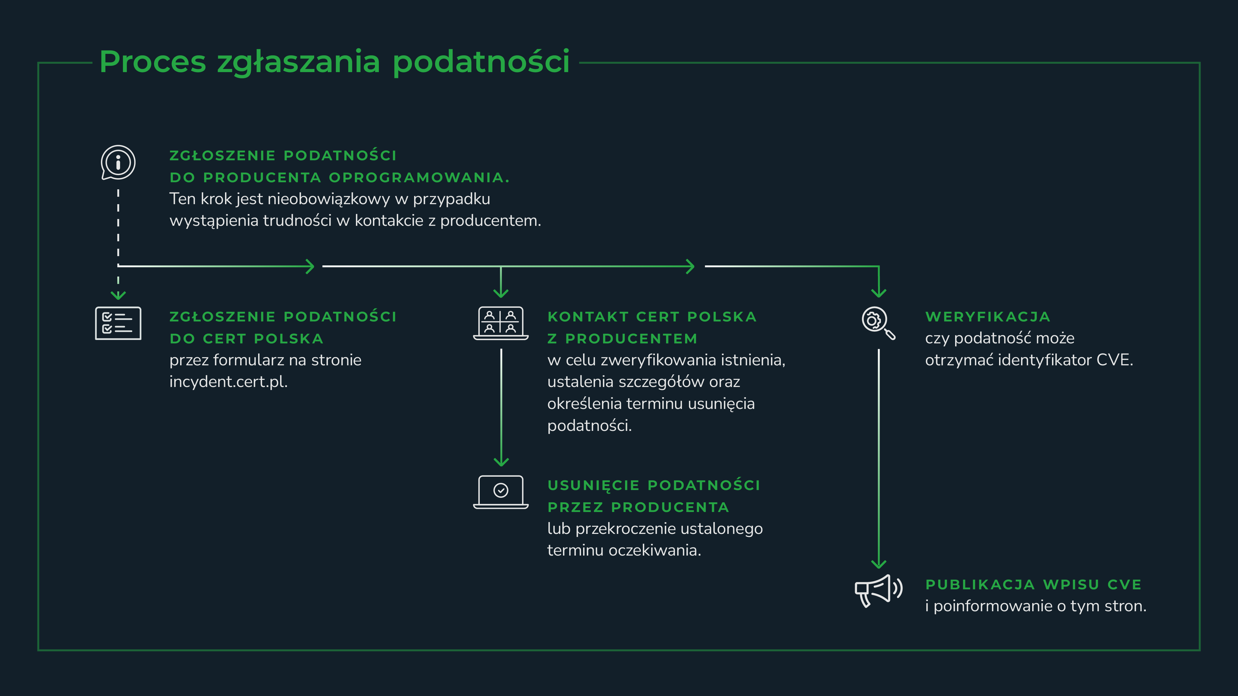 Przed zgłoszeniem znalezionej podatności do CERT Polska i upublicznieniem jej, zgłaszający powinien skontaktować się bezpośrednio z właścicielem podatnego systemu lub dostawcą oprogramowania.