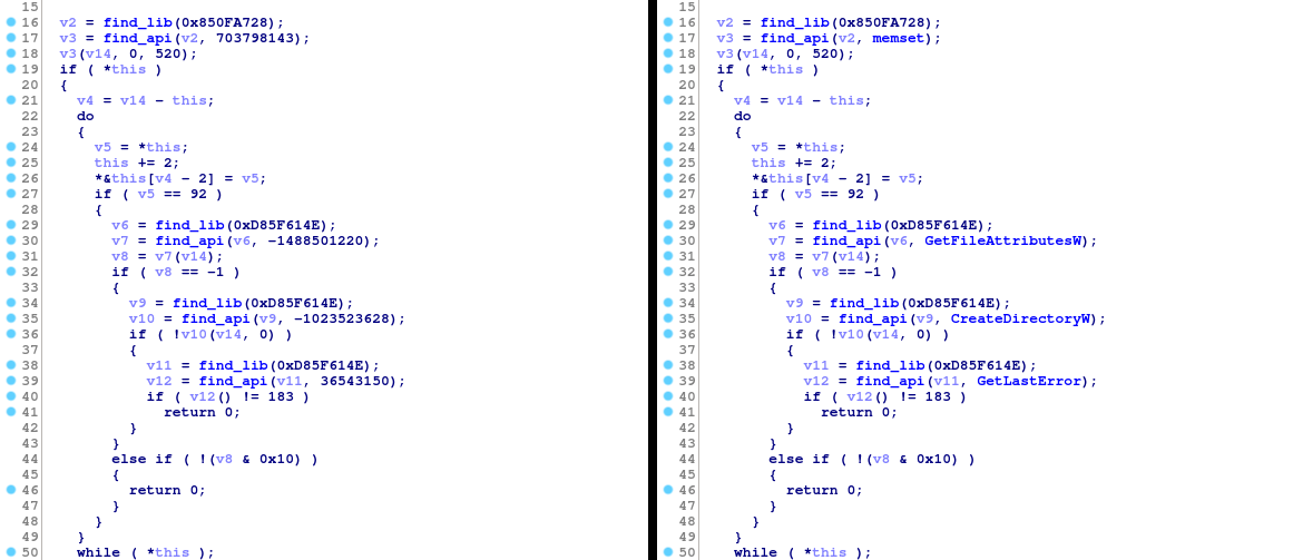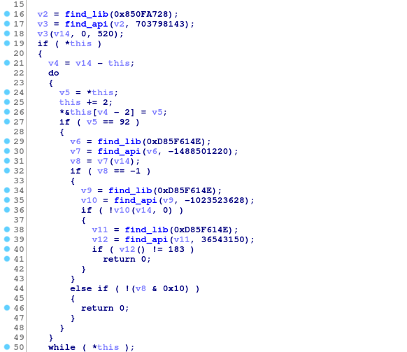 Another method of slowing down the analysis that the malware authors really like is hiding the Window API calls by replacing them with a custom lookup function.