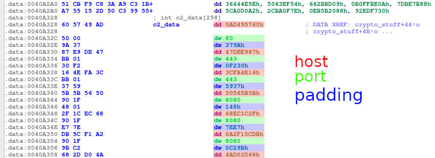 The method of retrieving C2 hosts has not changed. They are still stored as 8-byte blocks containing packed IP address and port.