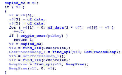 The RSA public key is stored as a regular encrypted string. It’s embedded in the binary in order to encrypt the AES keys used for secure communication with the C2. This will deter all communication eavesdropping attempts.
