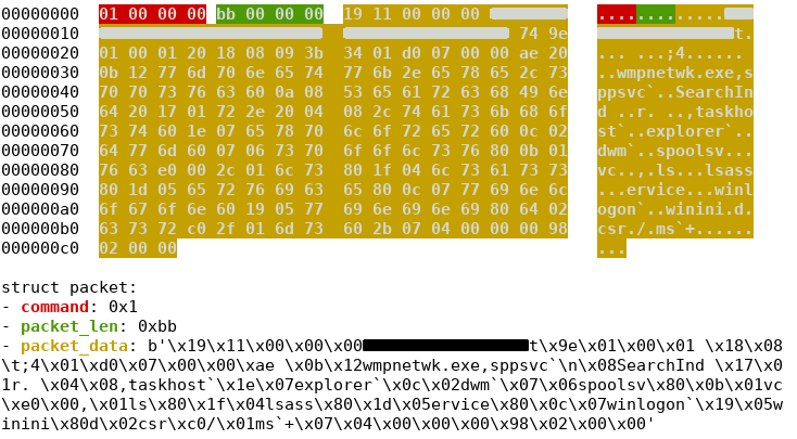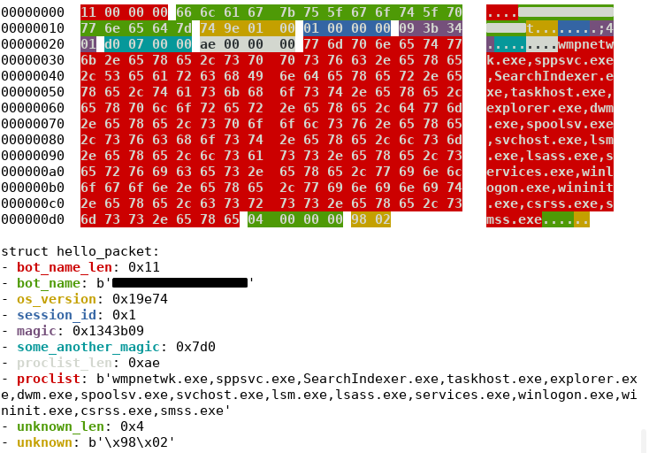 One of the observed packet types is the command used to register the bot on the botnet and receive modules to execute.