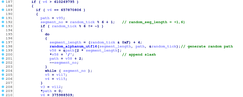 In order to make reverse engineering more difficult for researchers, a VM-like obfuscation was implemented. To achieve this, every function was split into basic blocks which were then repositioned into a simple state machine.