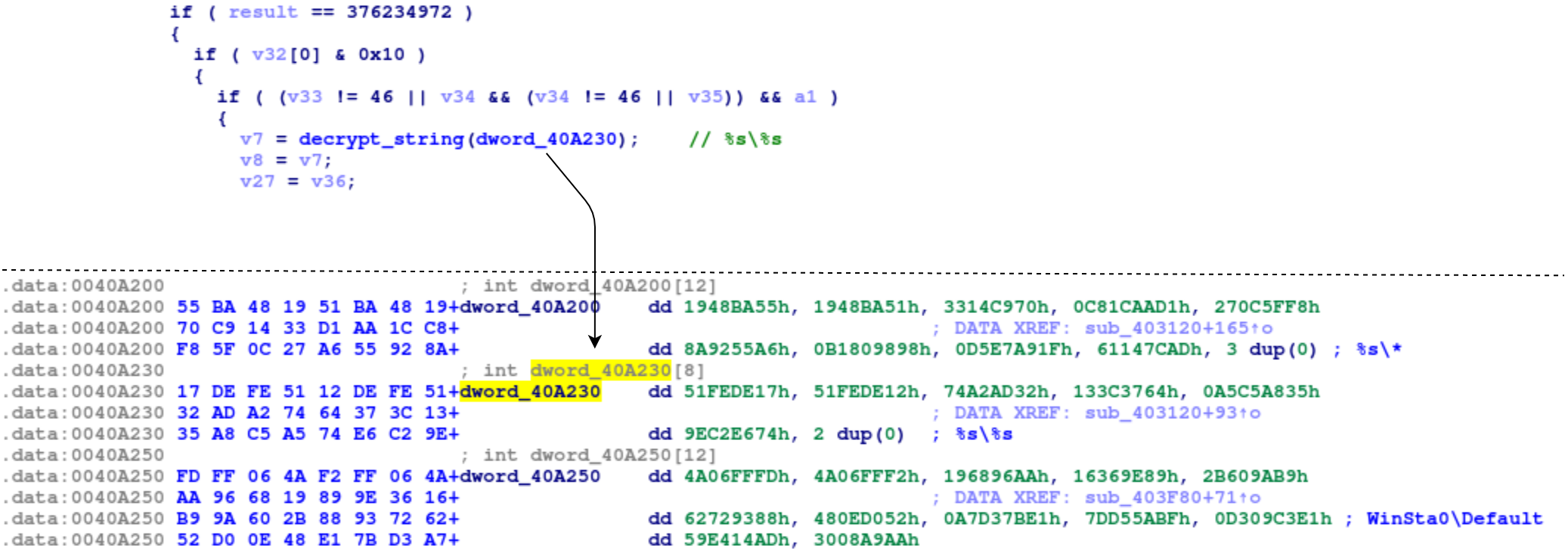 All used strings are encrypted almost like in the previous versions. Most noticeable difference is related to the xor key – it’s not passed as a parameter anymore. Instead, it’s located at the beginning of the data to be decrypted.