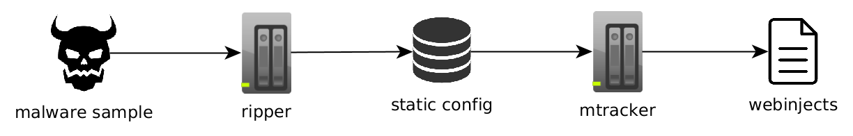 We have started with a static malware configuration extractor called ripper – one of our older projects. It’s able to extract hardcoded configuration from malware samples (for example: C&C server URLs, encryption keys etc). This was usually enough to start communication with malware and we used this data to semi-automatically download webinjects from known campaigns.