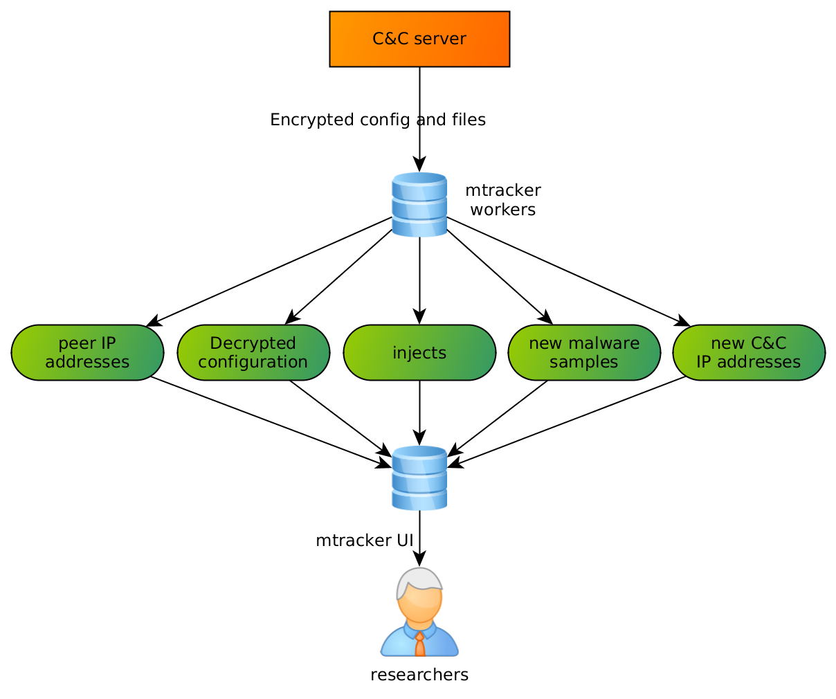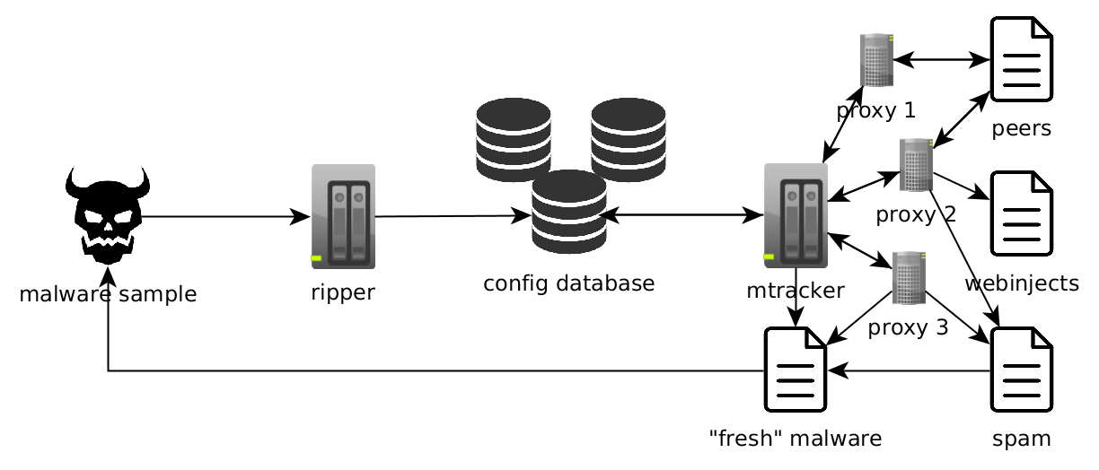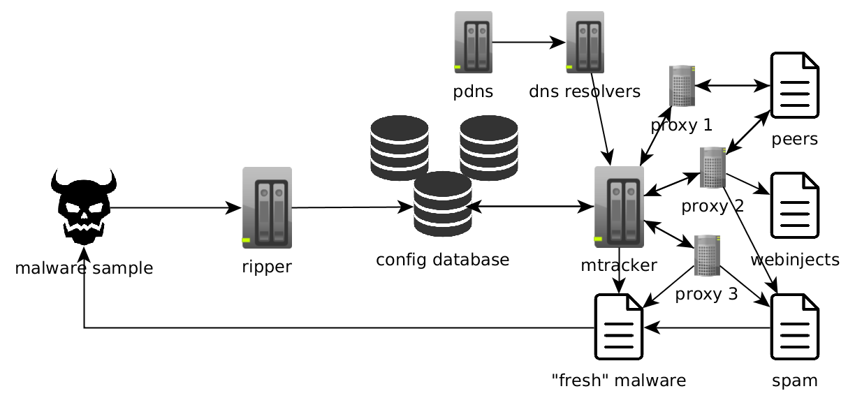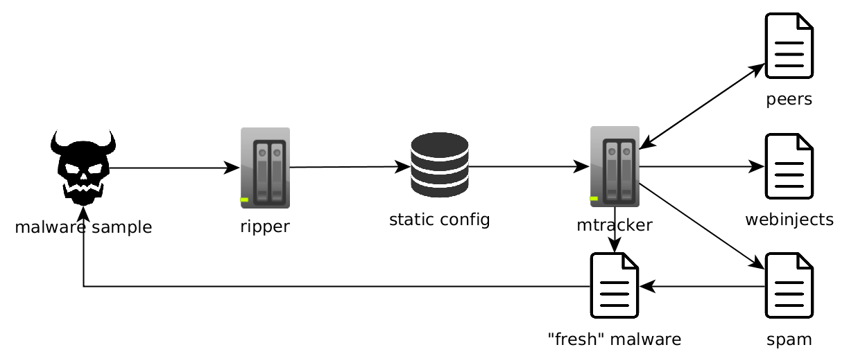In some sense, this is a conclusion of a lot of other projects. We have a few systems which collect raw data, and they are combined as inputs to mtracker to produce actual actionable information (like webinjects, spam templates, malicious IPs etc).