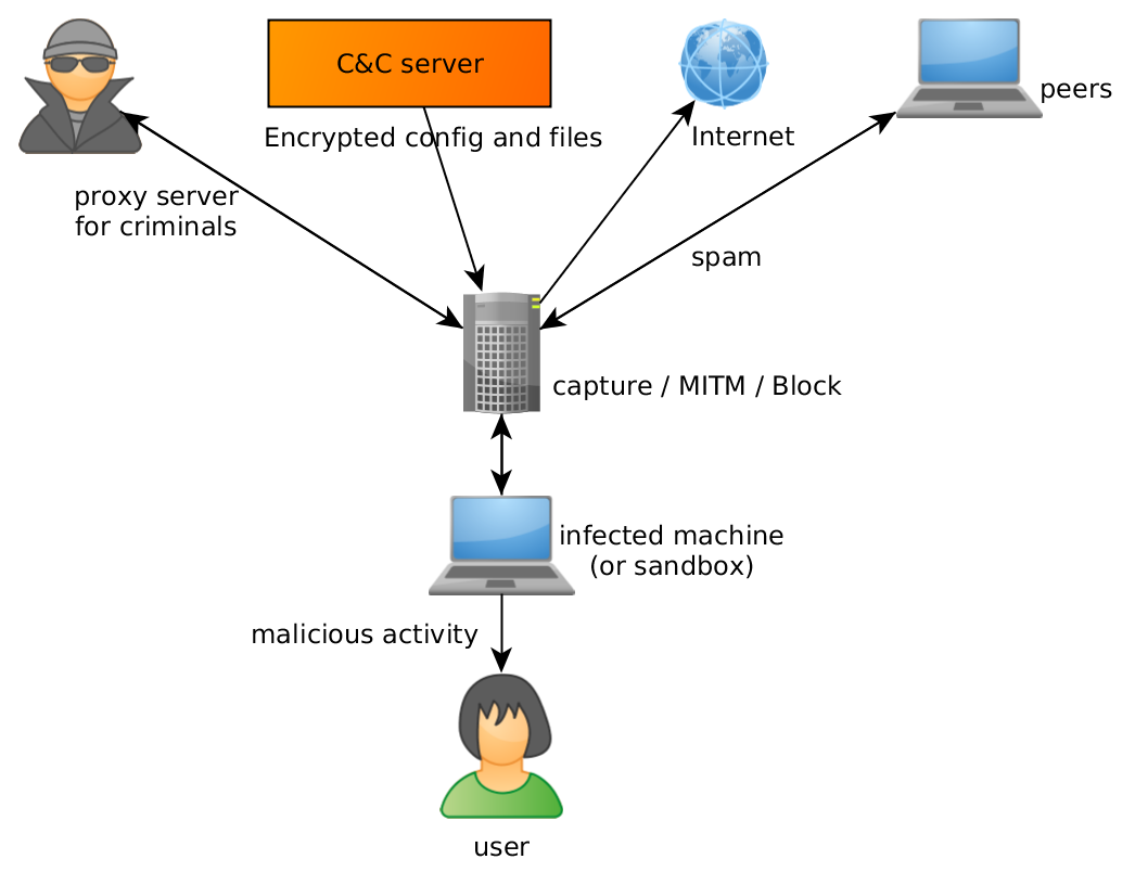 We have a deep knowledge about malware communication protocols (thanks to our proactive research in this regard), so we decided that we can reimplement networking stack of a few chosen malware families and communicate with them directly.