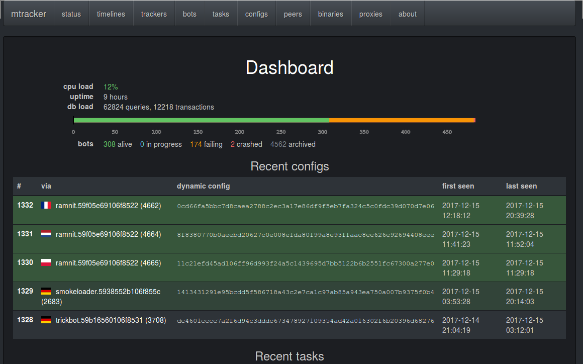 All configs are now being tracked from a few different proxies independently. This also allowed us to solve a problem of geolocalised campaigns – it’s very common that malware sample checks its location and refuses to infect computers outside of its target zone (most notable example is Dridex) or have a different set of injects/modules for every country (for example Emotet). Additionally, sometimes C&C servers are kept in the Tor network, so they can be reached only through a Tor proxy.