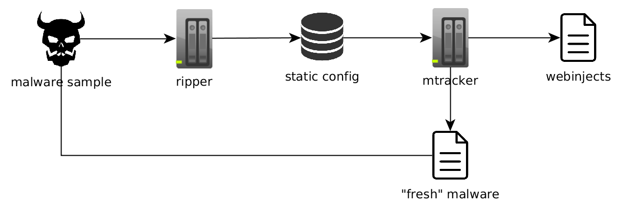 We have started with a static malware configuration extractor called ripper – one of our older projects. It’s able to extract hardcoded configuration from malware samples (for example: C&C server URLs, encryption keys etc). This was usually enough to start communication with malware and we used this data to semi-automatically download webinjects from known campaigns.