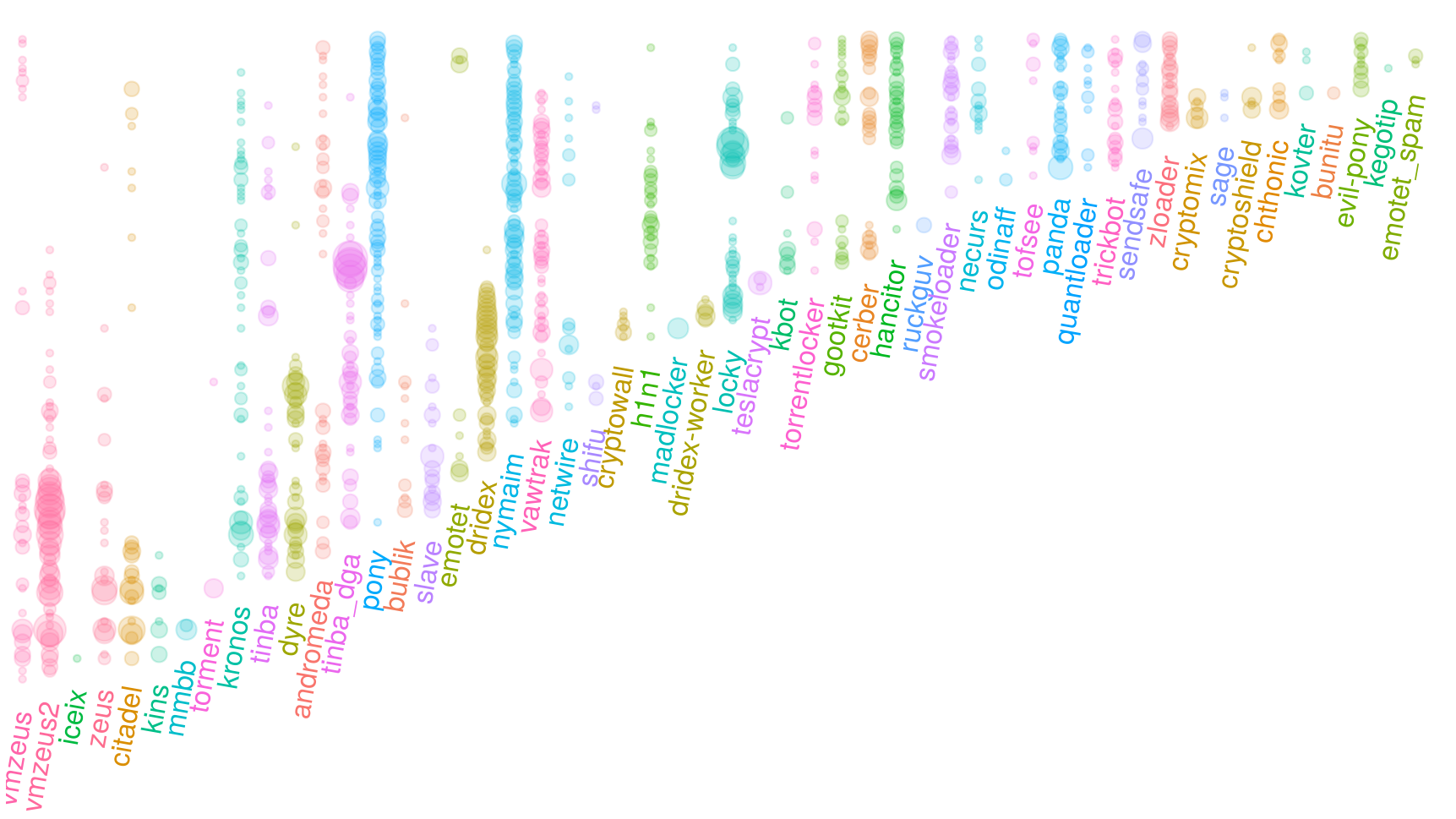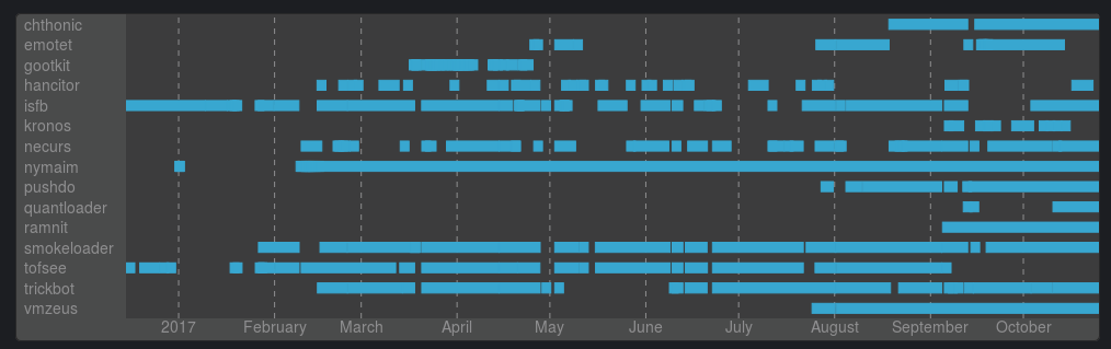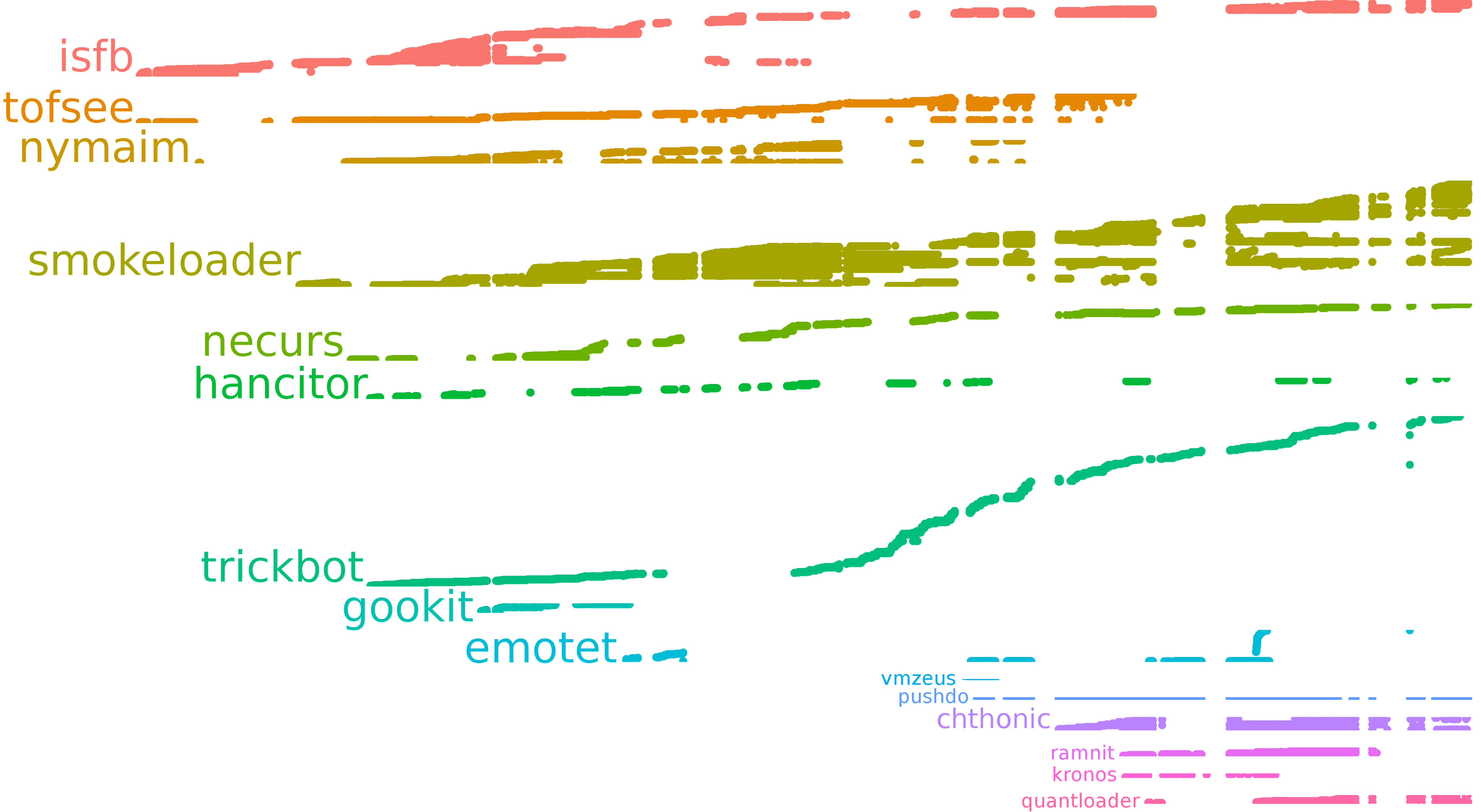 Of course, not all of these families were active all the time. A better overview of tracked malware history is given by the next image (time “flows upwards”, configs grouped by family):