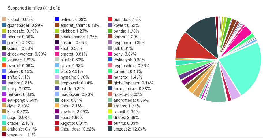 Most important source of information for us is the ripper and static configurations that can be used to track C&Cs. We have analyzed and can extract configurations from quite a lot of malware families. Percentage of distinct configurations by malware family that we have received: