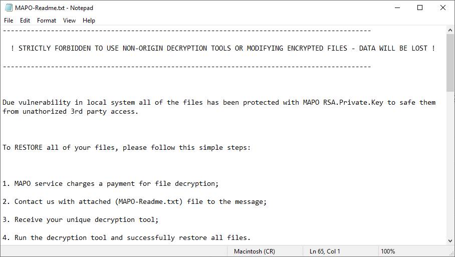 Our tool works with encrypted files having the .mapo extension and the following ransom note attached as “MAPO-Readme.txt” file: