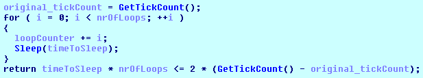 Jeśli nie zdecydujemy się na zakup to malware nie pozwoli na uruchomienie żadnego innego programu, informując, że jest on zainfekowany. Po zakupie otrzymujemy kod odblokowujący, który pozwoli nam normalnie korzystać z komputera. Powyżej przedstawiono okno skanowania. Malware ten zawiera również ciekawą funkcję, której celem jest sprawdzenie czy program nie jest debugowany. Przez porównywanie wartości zwracanej przez GetTickCount z wartościami podawanymi do funkcji Sleep można sprawdzić czy program nie jest zatrzymywany w trakcie wykonania. Funkcja porównująca te wartości jest zaprezentowana poniżej.