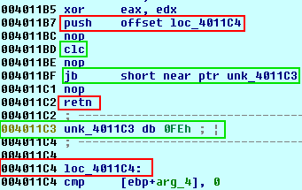 To złośliwe oprogramowanie zawiera również ciekawe techniki utrudniające deasemblację oraz analizę wykonania w debuggerze. Pierwszą z nich jest połączenie techniki PUSH/RET z nieosiągalnymi warunkami. Na rysunku umieszczonym po lewej stronie kolorem czerwonym zaznaczono sekwencję PUSH/RET, która doprowadzi do wykonania instrukcji pod adresem 4011C4. Natomiast niemożliwa do zrealizowania instrukcja warunkowa (oznaczona na zielono, osiągnięta dzięki sekwencji CLC/JB) prowadziłaby do adresu 4011C3. Przez to oprogramowanie służące do deasemblacji, w większości przypadków, nie jest w stanie poprawnie przedstawić kod.
