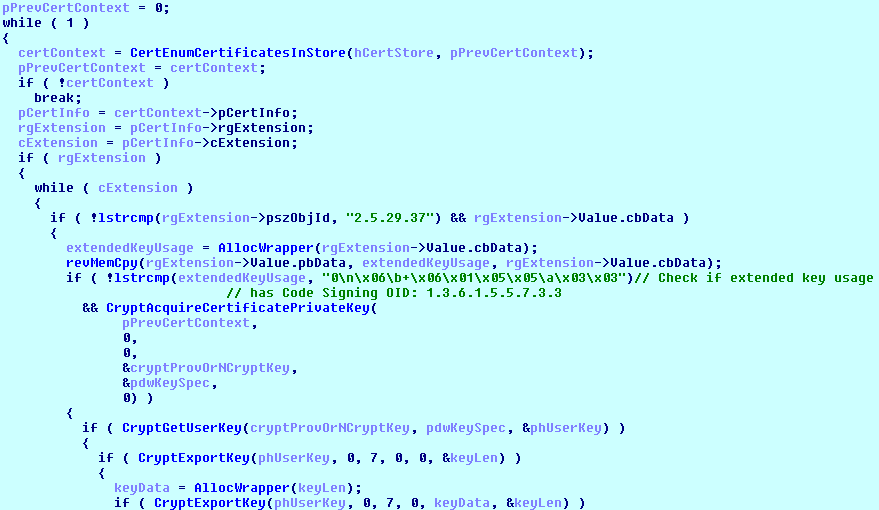 Oprócz tego aplikacja kradnie certyfikaty X509 użytkownika służące do podpisywania aplikacji. Poniżej znajduje się fragment kodu odpowiedzialny za kradzież tych danych.