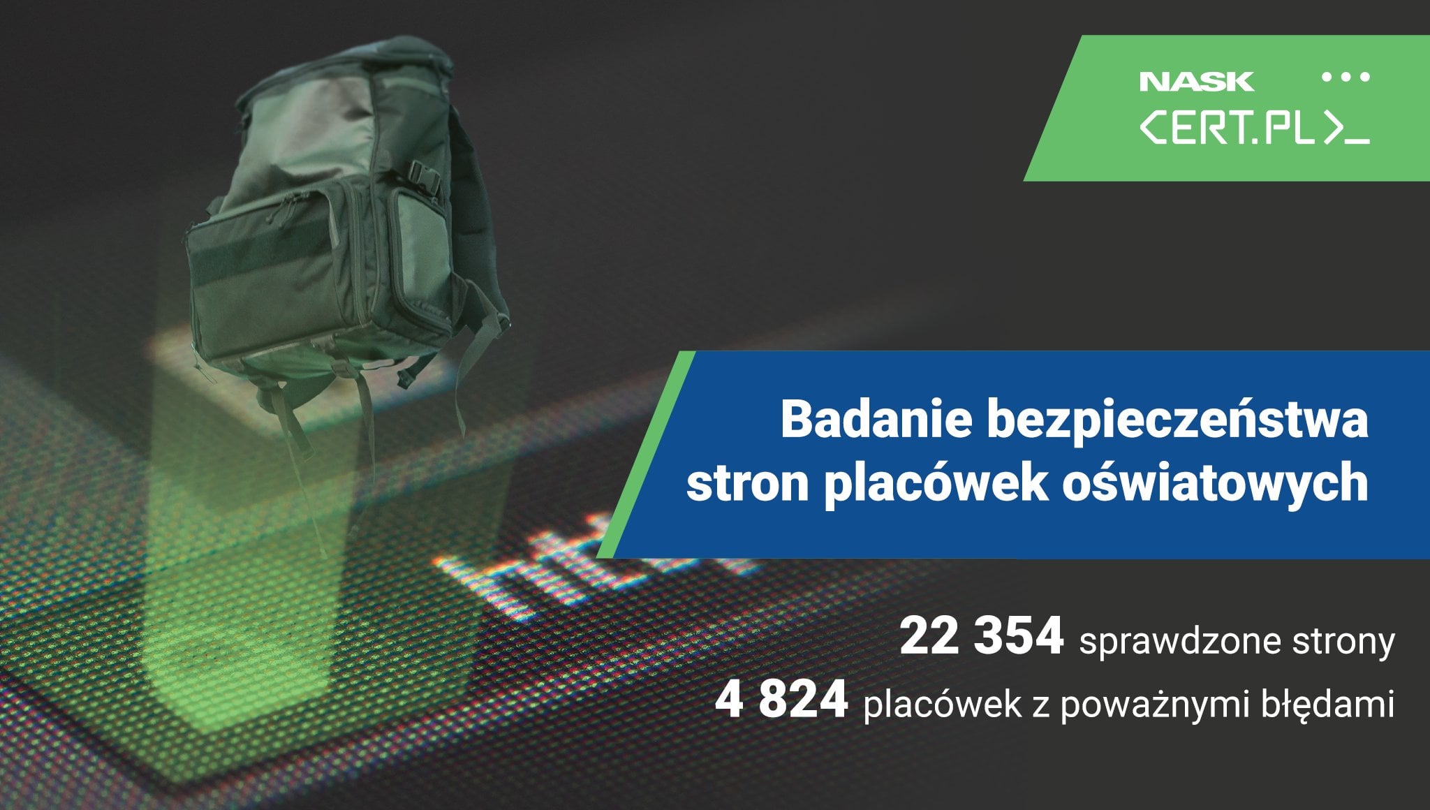 Zespół CERT Polska między 19 czerwca a 15 sierpnia 2020 przeprowadził nieinwazyjne badanie bezpieczeństwa stron placówek oświatowych. Badanie objęło 22 396 stron, stanowiących 17 911 unikalnych domen oraz 6602 unikalnych adresów IP. Większość z nich stanowiły szkoły podstawowe (6815), przedszkola (5272) oraz licea ogólnokształcące (1266). Listę stron do badania pozyskano z wykazu szkół i placówek oświatowych (stan z 20.05.2020).