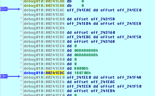 Jeśli program został uruchomiony z podłączonym do niego debuggerem (czyli ze zmienionym środowiskiem uruchomieniowym), uruchamiane są też mechanizmy analizy sterty. Mechanizmy te (nie będziemy ich opisywać w tym artykule) ułatwiają wykrywanie różnych błędów, między innymi przepełnień. Jedną z oznak tego faktu (a co za tym idzie, oznaką obecności debuggera) jest dodanie do wybranych miejsc pamięci ciągów heksadecymalnych: 0xABABABAB oraz 0xFEFEFEFE. Powoduje to zmianę przesunięć pomiędzy niektórymi z umieszczonych w pamięci struktur. Błędne odwołanie do pola Buffer w [6] bez tych przesunięć powoduje załadowanie do rejestrów innych wartości, niż z nimi. W efekcie, jeśli program jest uruchomiony bez debuggera, rejestr ESI zawiera jeden ze wskaźników struktury LDR_MODULE, natomiast jeśli jest uruchomiony bez debuggera – zawiera nieokreśloną bliżej wartość, która nie wskazuje poprawnej wartości w pamięci (tak jak w przykładzie z odwołaniem do adresu 0), więc wywołuje wyjątek kończący pracę programu.