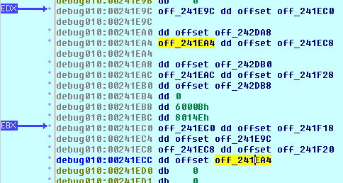 A więc, EDX wskazuje na pole Flink struktury LIST_ENTRY. Pole to wskazuje na następny element powiązanej listy cyklicznej LIST_ENTRY. Następny element jest ładowany przez skopiowanie tej wartości do EDX, czyli, jak już wspomnieliśmy, za pomocą instrukcji: